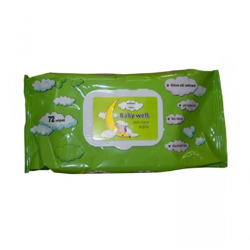 A Baby Well "zöld" törlőkendő egy különleges anyagból készült bőrápoló törlőkendő, mely rendkívül puha és kellemes tapintást nyújt a baba bőrének. Az olívaolaj kivonatnak köszönhetően tökéletesen tisztítja és felfrissíti a baba bőrét, valamint megelőzi a pelenka okozta irritációt. A csomagban 72 db törlőkendő található.